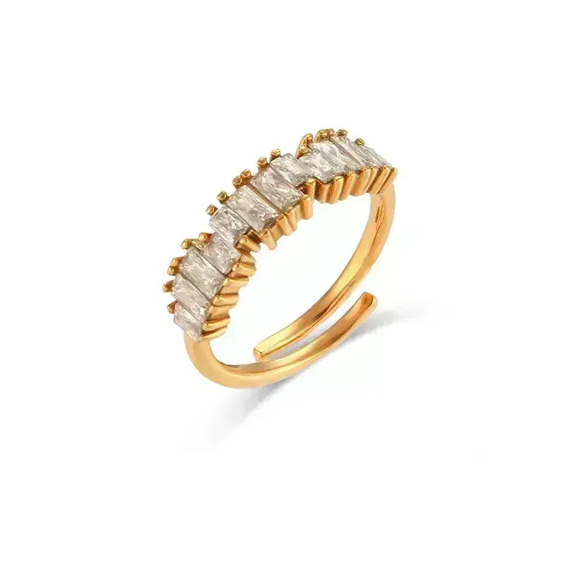 Ένα λαμπερό επιχρυσωμένο δαχτυλίδι από ανοξείδωτο ατσάλι που αγκαλιάζει την κομψότητα του χρυσού. Διακοσμημένο με μικρές διάφανες πέτρες ζιρκόνιο που λάμπουν σαν αστέρια.Το ρυθμιζόμενο άνοιγμα προσφέρει ευελιξία στην εφαρμογή ενώ η λεπτομερής κατασκευή υπογραμμίζει την αισθητική της φινέτσας και της πολυτέλειας.