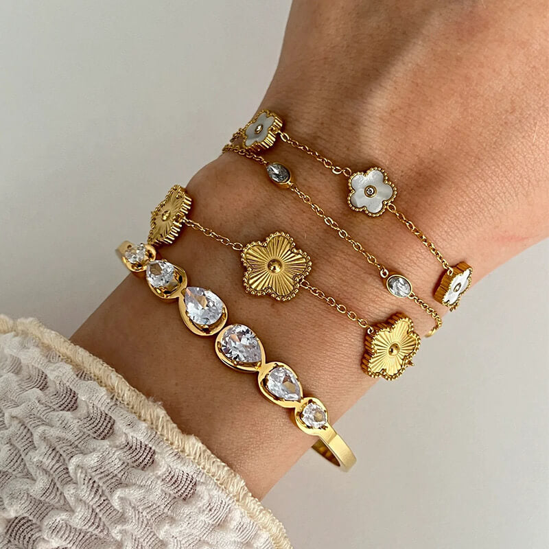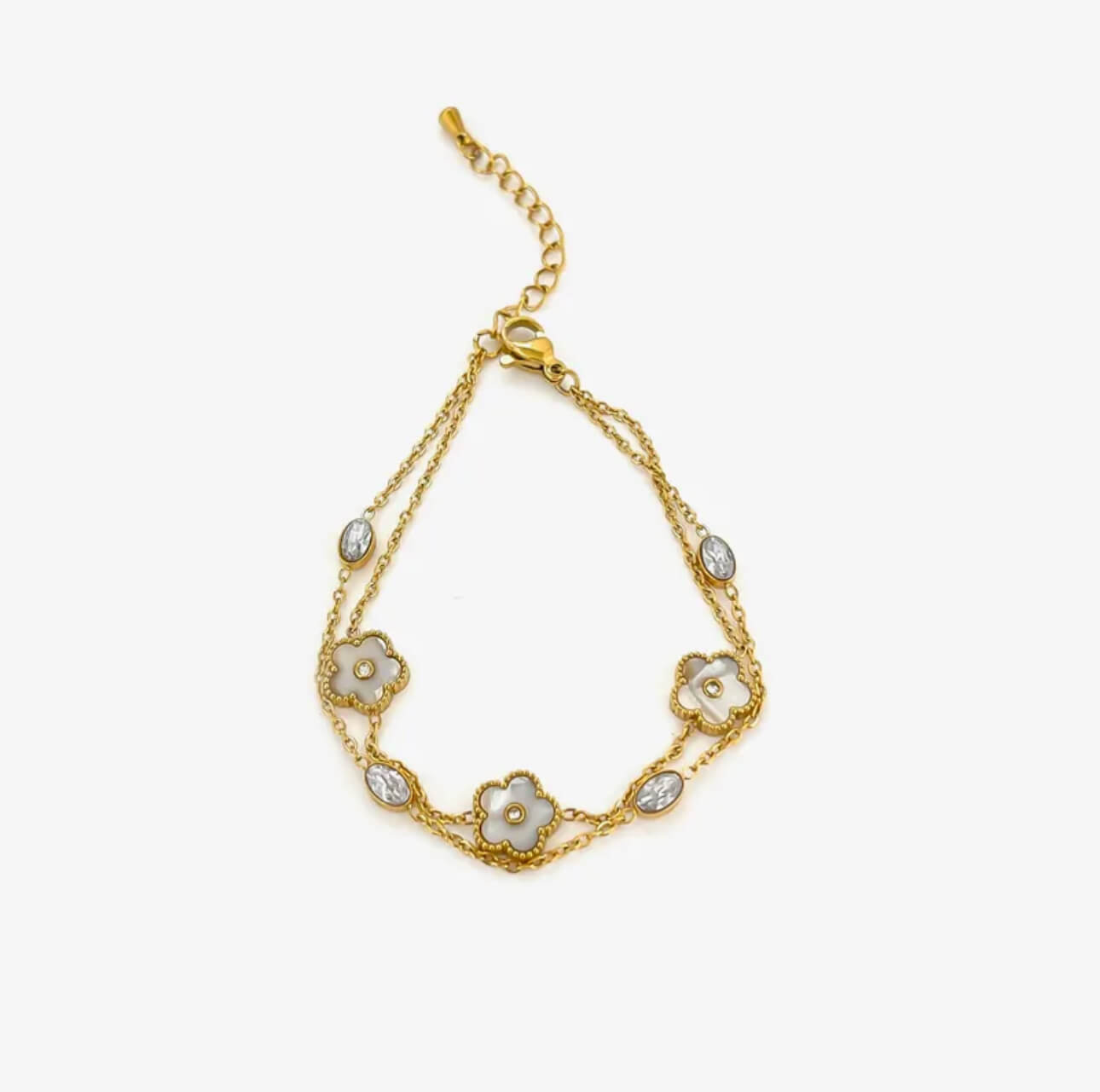 Αυτό το βραχιόλι διπλής αλυσίδας διακοσμημένο με άνθη και διακριτικούς κρυστάλλους αποπνέει κομψότητα και θηλυκότητα. Η επιχρυσωμένη αλυσίδα προσδίδει ζεστασιά και λάμψη, ενώ τα λουλούδια δημιουργούν ένα απαλό και αρμονικό αποτέλεσμα.