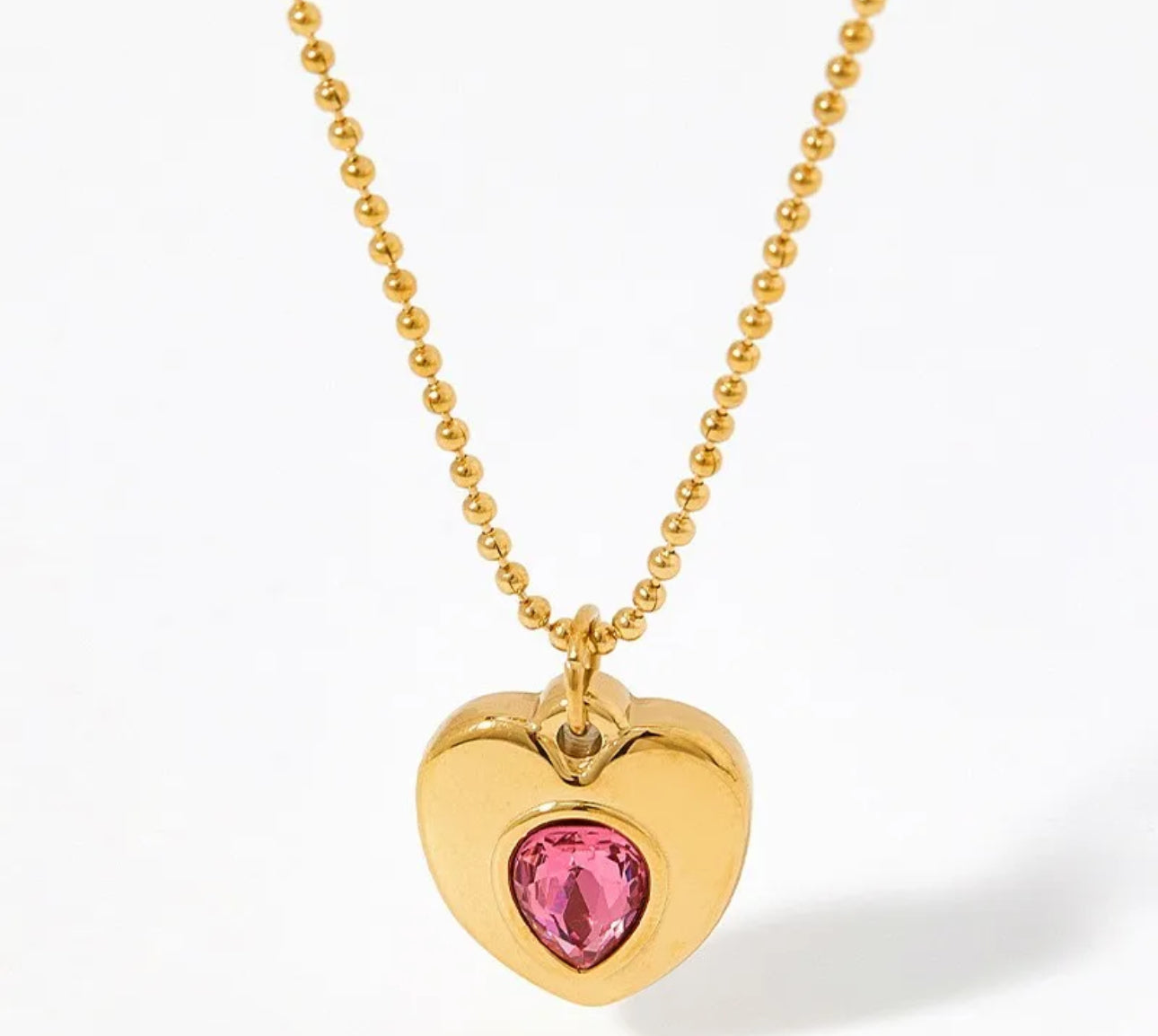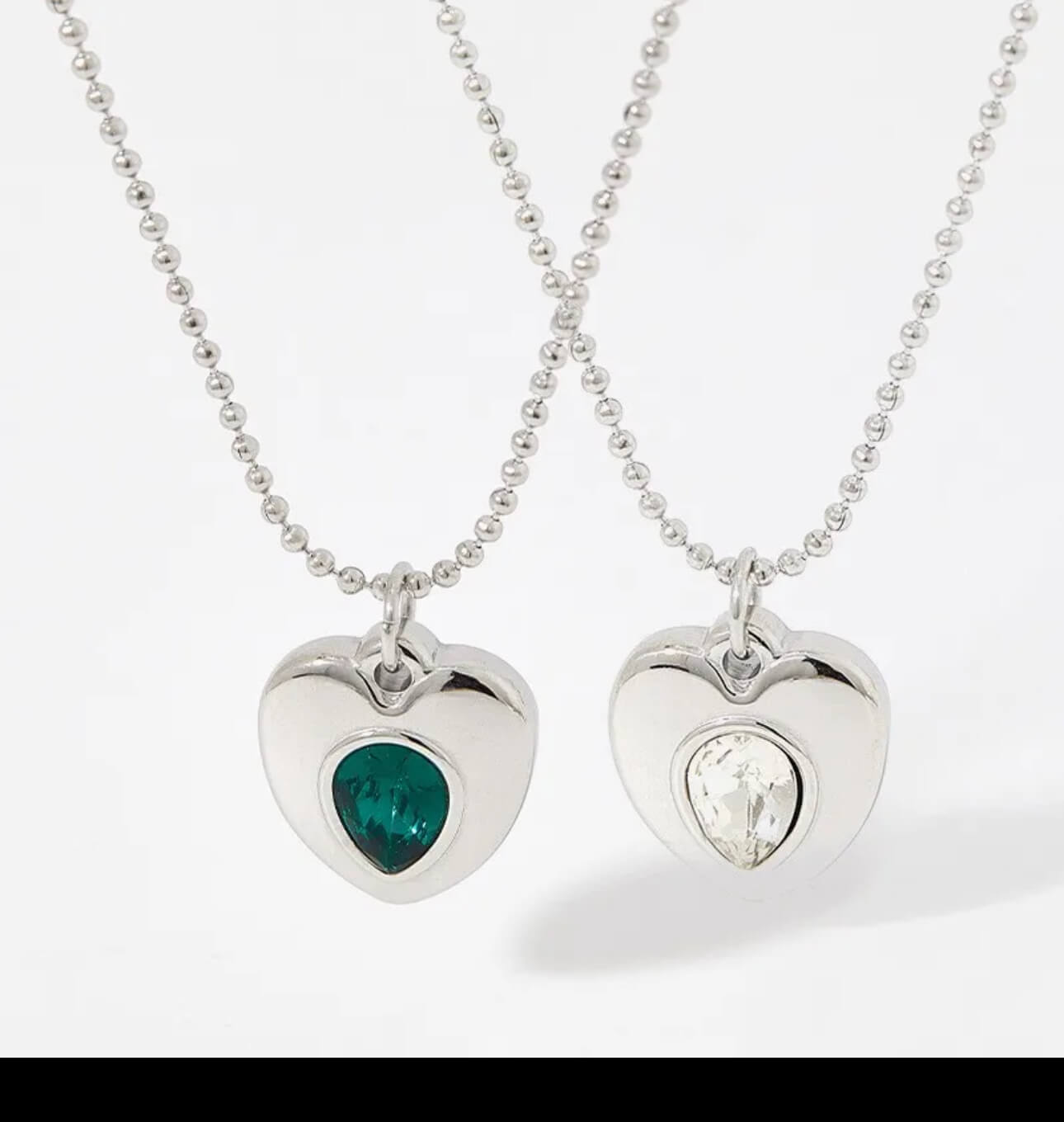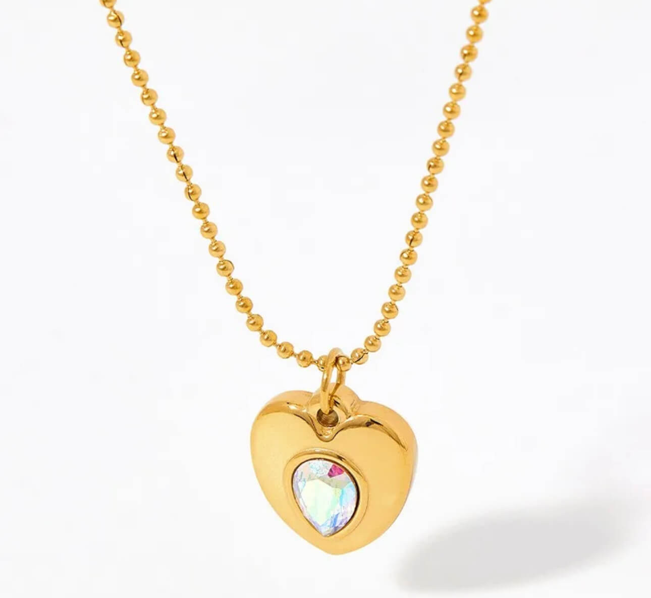 Κολιέ σε σχήμα καρδιά με κρυστάλλους στο κέντρο. Το κολιέ διαθέτει μια κομψή αλυσίδα από χρυσές ή ασημί σφαιρίτσες ιδανικό για ρομαντικά και κομψά looks.
