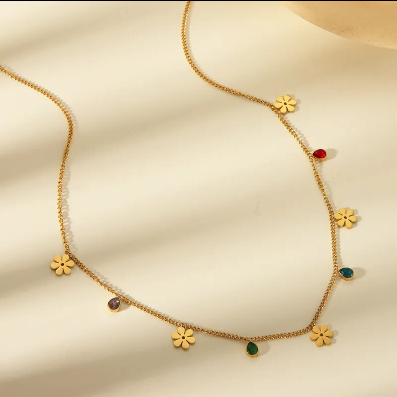 Προσθέστε μια χαρούμενη και ζωντανή πινελιά στην εμφάνιση σας με αυτό το υπέροχο χρυσό κολιέ. Το κολιέ διαθέτει διακριτικά λουλούδια και πολύχρωμες πέτρες που δίνουν έναν παιχνιδιάρικο και κομψό χαρακτήρα στο κόσμημα.