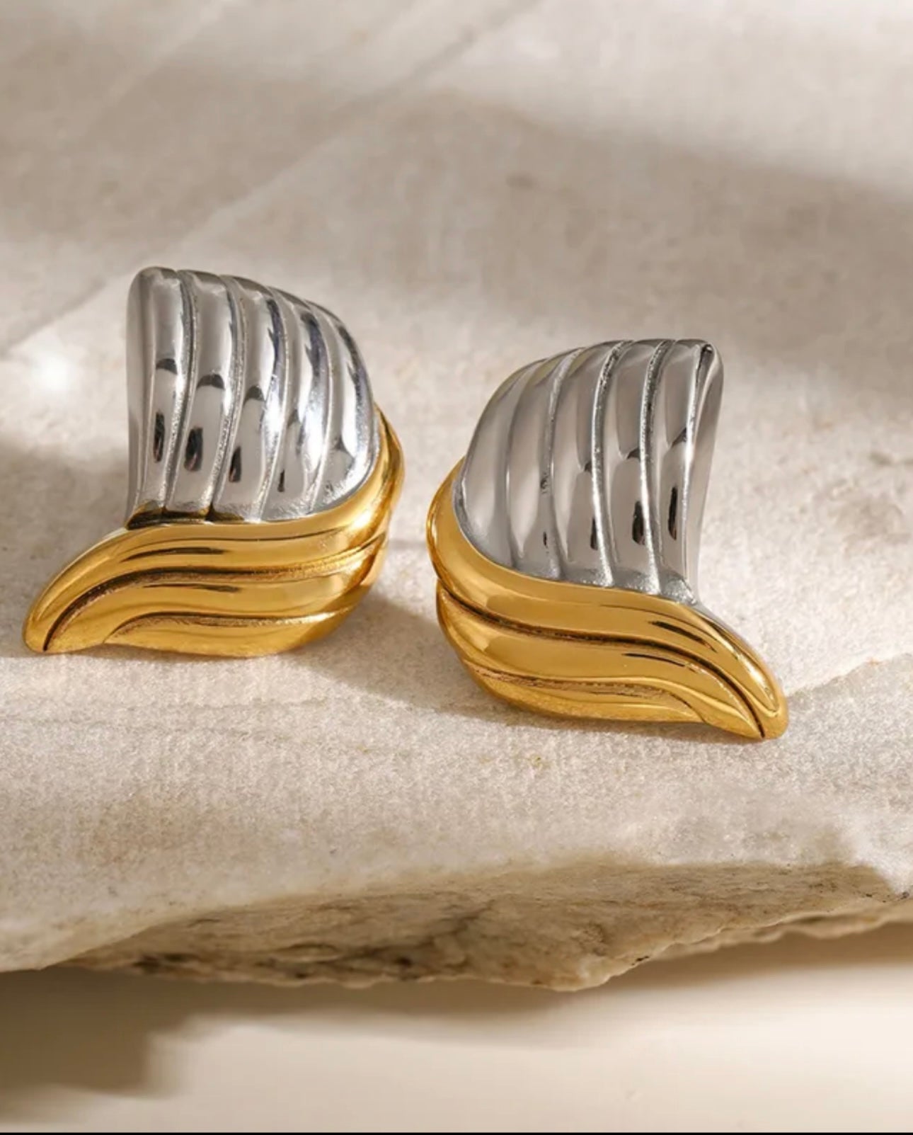 Αυτά τα εντυπωσιακά σκουλαρίκια διαθέτουν έναν μοναδικό συνδυασμό χρυσού και ασημιού με ανάγλυφο σχέδιο που θυμίζει κύματα ή φτερά. Ιδανικά για μια elegant και πολυτελή εμφάνιση που ξεχωρίζει. Ένα απόλυτα διαχρονικό αξεσουάρ που θα αναδείξει ένα outfit.