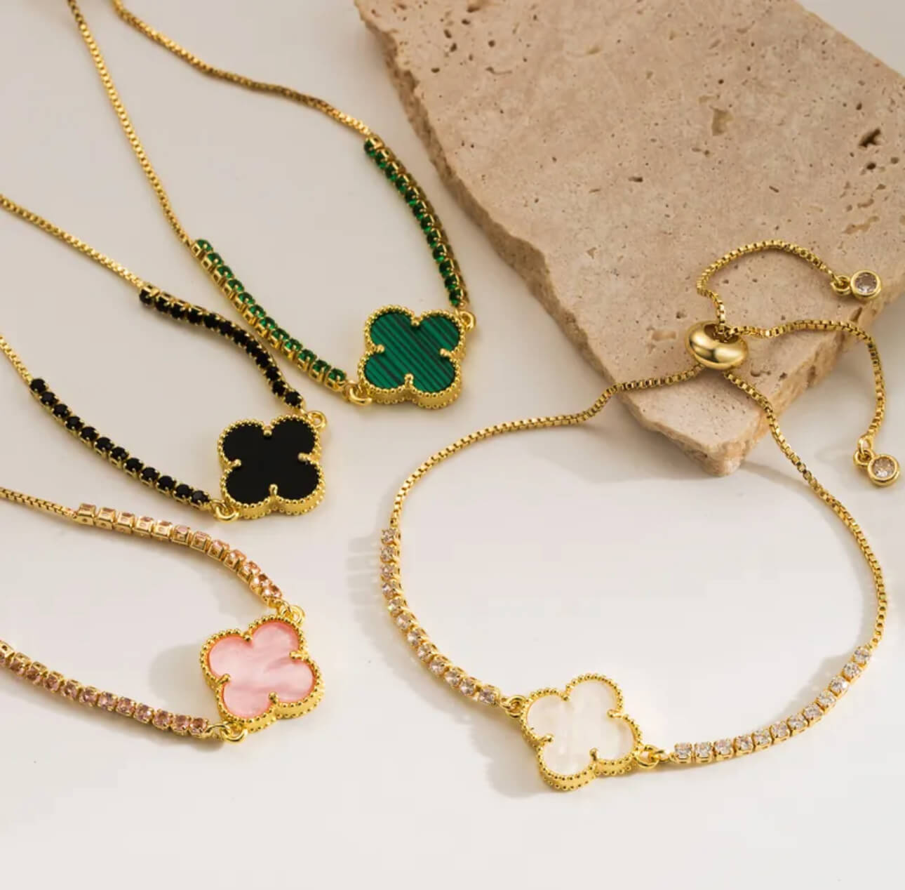 Αναδείξτε την κομψότητα σας με αυτή τη συλλογή βραχιολιών, διακοσμημένα με μοντέρνο μοτίβο λουλουδιού και λαμπερές αποχρώσεις. Με επιλογές σε πράσινο, μαύρο, ροζ και λευκό, αυτά τα βραχιόλια προσφέρουν μια πολυτελή αίσθηση χάρη στην χρυσαφί αλυσίδα και τις λεπτομέρειες από πολύτιμες πέτρες. Τα βραχιόλια διαθέτουν ρυθμιζόμενο κούμπωμα για άνετε εφαρμογή,καθιστώντας τα ιδανικά για κάθε μέγεθος καρπού.