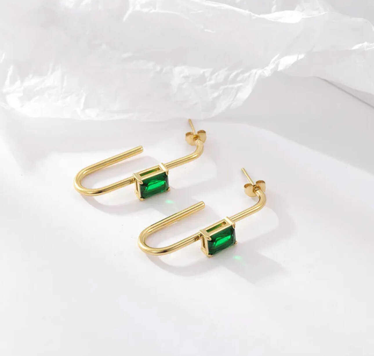 Αυτά τα σκουλαρίκια αποπνέουν μια σύγχρονη κομψότητα με τον μινιμαλιστικό σχεδιασμό τους. Κατασκευασμένα από χρυσό υλικό, διαθέτουν ένα μοναδικό σχήμα U το οποίο συγκρατεί έναν εντυπωσιακό, διαυγή κρύσταλλο σε ορθογώνιο κόψιμο στο κέντρο. Η απλότητα και η γεωμετρική ακρίβεια του σχεδίου τα καθιστούν ιδανικά για γυναίκες που επιθυμούν να προσθέσουν μια διακριτική αλλά ταυτόχρονα λαμπερή πινελιά στην εμφάνιση τους.