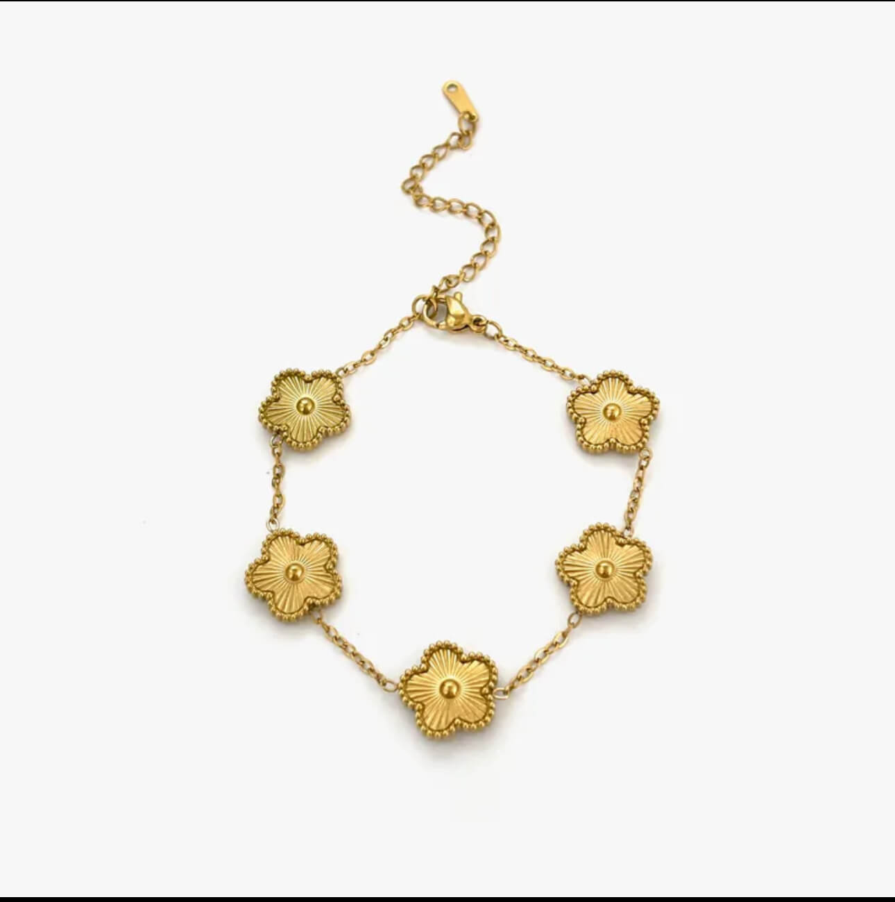 Αυτό το βραχιόλι με χρυσή αλυσίδα και λουλουδένια μοτίβα αποπνέει διαχρονική γοητεία και φυσική ομορφιά.Κάθε λουλούδι είναι σμιλεμένο με ανάγλυφες λεπτομέρειες, προσδίδοντας βάθος και κλασικό στυλ στο κόσμημα.