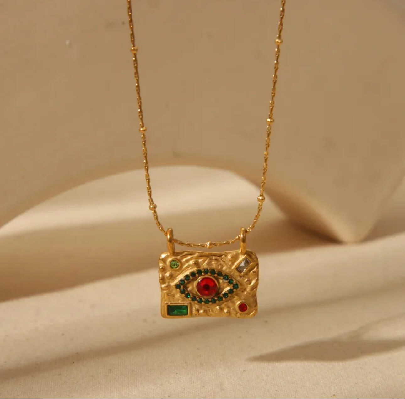 Εντυπωσιακό μενταγιόν σε σχήμα ματιού με πολύχρωμες πέτρες, σε επίχρυση βάση. Ιδανικό για να προσθέσετε μια ξεχωριστή πινελιά στην εμφάνιση σας, συμβολίζοντας προστασία και καλή τύχη. Φορέστε το μόνο του ή συνδυάστε το με άλλα κολιέ για ένα μοντέρνο layreing.
