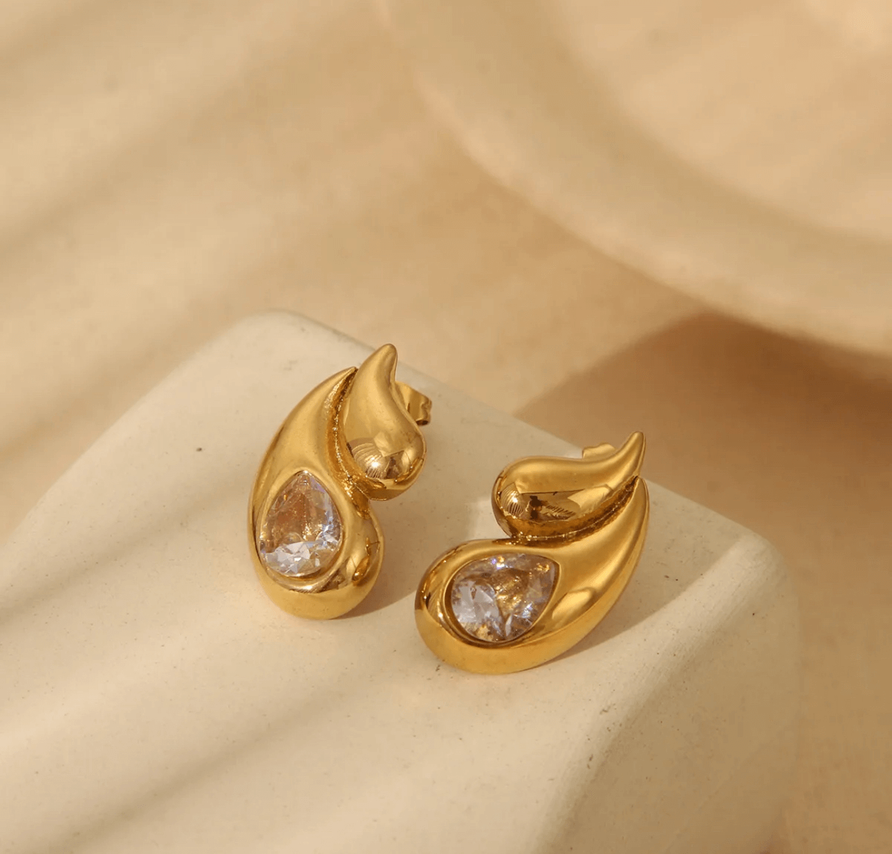 Χρυσά σκουλαρίκια σε αφηρημένο, οργανικό σχήμα, που θυμίζει ρευστές καμπύλες.Διαθέτουν ενσωματωμένες λαμπερές πέτρες σε σχήμα σταγόνας, προσδίδοντας μια αίσθηση πολυτέλειας και κομψότητας.
