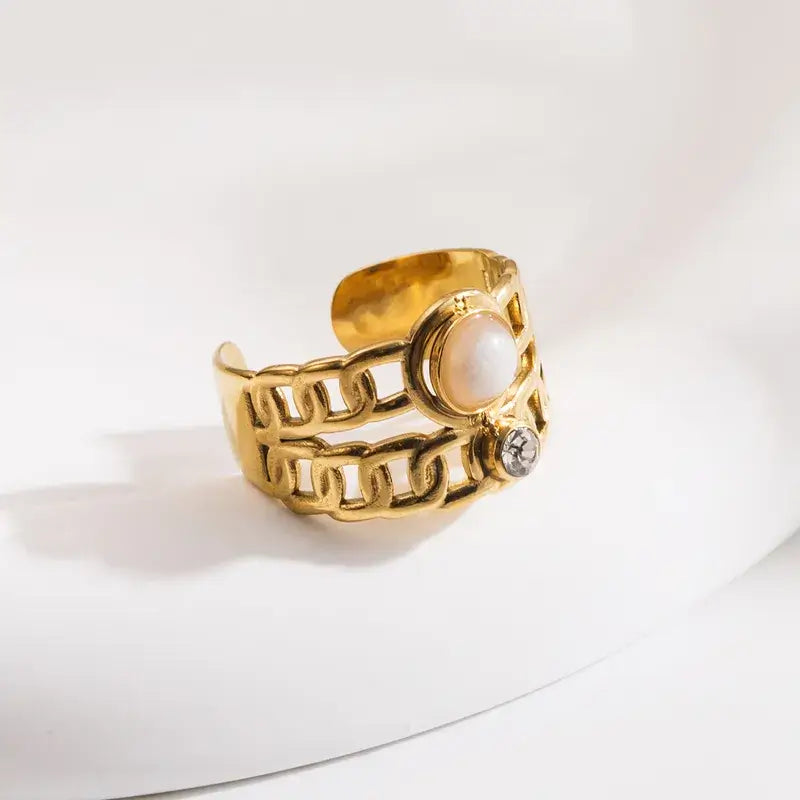 Ένα δαχτυλίδι από επιχρυσωμένο ατσάλι. Διαθέτει δύο σειρές που διακοσμούνται από δύο πέτρες αντίστοιχα.Η λεπτομερής κατασκευή του δίνει μια αίσθηση κομψότητας και πολυτέλειας κάνοντας το ιδανικό για κάθε επίσημη ή κοσμική περίσταση.