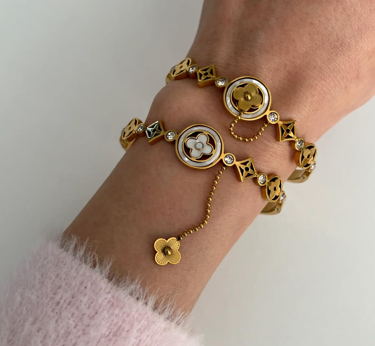 Δώστε έναν αέρα πολυτέλειας στην εμφάνισης σας με αυτό το εκλεπτυσμένο βραχιόλι. Συνδυάζει μοναδικά μοτίφ και αστραφτερές λεπτομέρειες από κρύσταλλα, ενώ η κρεμαστή αλυσίδα με το λουλουδένιιο στοιχείο προσθέτει μια παιχνιδιάρικη νότα.